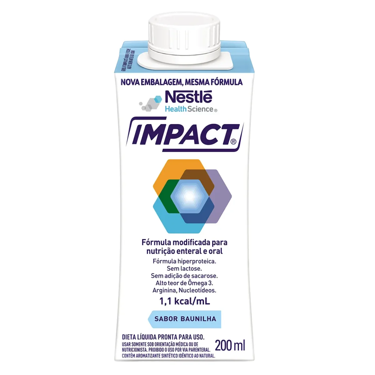 O IMPACT 200ml da Nestlé é uma fórmula nutricional hiperproteica e imunomoduladora, indicada para indivíduos em situações clínicas que exigem suporte nutricional avançado, como períodos de pré e pós-operatório.